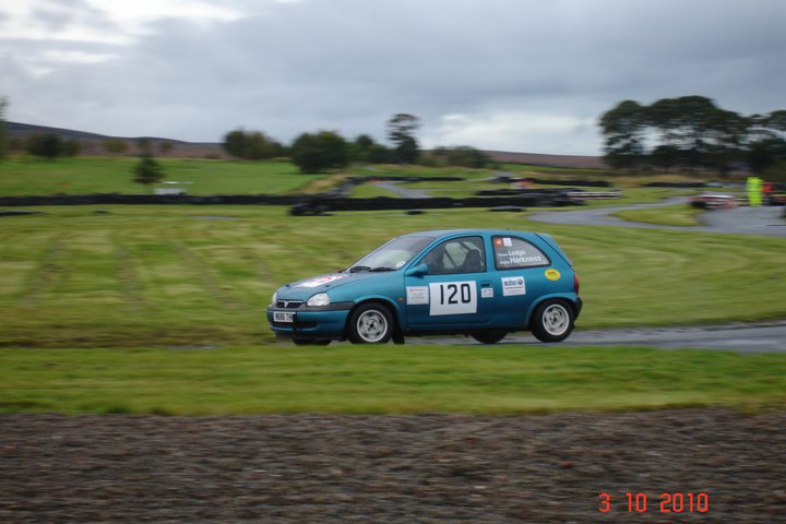 My run included a bit of a clatter around on the concrete at the hairpin and my time was 110.98, this appeared quite respectable. Geoffrey was 8 sec faster, but he’s had loads more practice at this than I have. Then the rain came again, however I was pleased to find out that I’d matched my previous time even in the wet. On the final run I wasted quite a bit of time trying to get away from the start line, I also bottled it again on ‘Norries Corner’ the right leading downhill to the left – ‘Gemmels Corner’, something that I’d done on all of my runs, as I think that I’d convinced myself that I’d go skating across the grass if I’d put any power in there.